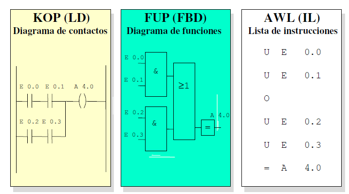 Como se ha indicado en la unidad anterior es la norma UNE-EN 611131-3 (en concordancia con la IEC 1131-3) en la que aparecer regulados los tres lenguajes de programación, dos de ellos en formato de texto y dos en formato gráfico. Los lenguajes son Ladder Diagram (LD) o (KOP) son los denominados lenguaje gráfico de contactos. Por otra parte los está el lenguaje gráfico de funciones lógicas o (FBD o FUP). Por último está el lenguaje por lista de instrucciones (IL o AWL). Todos ellos son equivalentes y «traducibles» cuya equivalencia se asienta en los sistemas lógicos.
